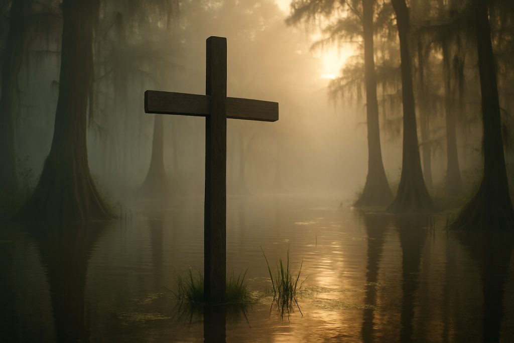 A wooden cross stands in a Louisiana swamp at sunrise, representing Phil Robertson’s journey from darkness to faith