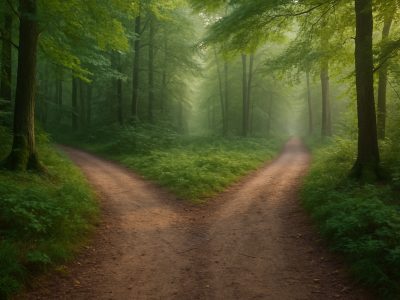A forest path splits in two, symbolizing the false hope of intentional communities without Christ